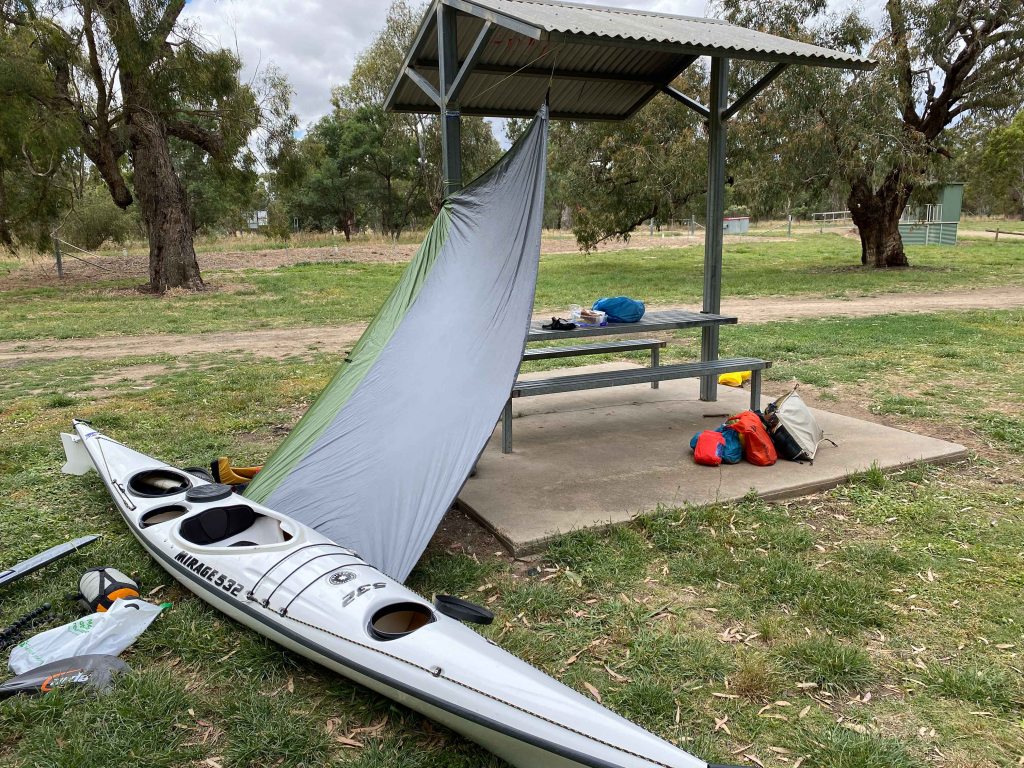 I pulled up on the makeshift boat ramp at the caravan park in Wagga Wagga around noon, just as the GPS ticked over exactly 120km for the entire trip. As I walked (the long way) to the office of the caravan park, I saw that the “unpowered” camping area was a massive, exposed, football oval sized lawn in the middle of the park. There was a solitary tent and suitcase, containing a strange old lady, planted right in the middle. I decided that I had no interest in spending another day/night in my 1 person tent in the middle of an oval, so I upgraded to a cabin. I then had to haul all my gear and kayak (three trips) across the caravan park. This is the last time I don’t take my kayak trolly with me on a multi-day trip.