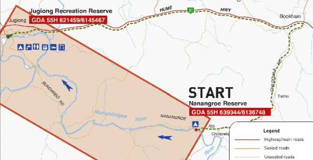 Knowing that I would not be able to get enough time off to do a major expedition (i.e. 7 days) for a while, it happened that we were coming down to Binalong (near Yass) to our family property for the weekend. So I thought it might be a good chance to do one section of it. The challenge though would be organising the car shuffle so that I could leave my car at the top of the river and then get back to it once I had finished. Fortunately there is a great cafe (The Long Track Pantry) in Jugiong, so it did not take too much convincing for my family to agree to meet me there for lunch. This was the deciding factor in choosing the Nanangroe Reserve to Jugiong section.