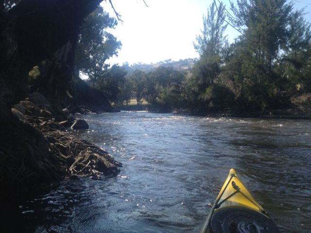 I ended up getting on the water at about 7.30 and headed downstream. As I went around the first corner, I heard the sound of rapids. To my surprise there were quite a lot of rapids (little Grade 1’s) on the river. Whilst they were not difficult rapids, it was interesting learning how to use navigate my Sea Kayak around the various rocks and snags. It reminded me of watching the barges steering around obstacles in the canals in Europe, in that you had to turn early on and hope the boat made it around in time. I also spent a lot of the paddle lifting and lowering my rudder so it didn’t get ripped off by any of the rocks.