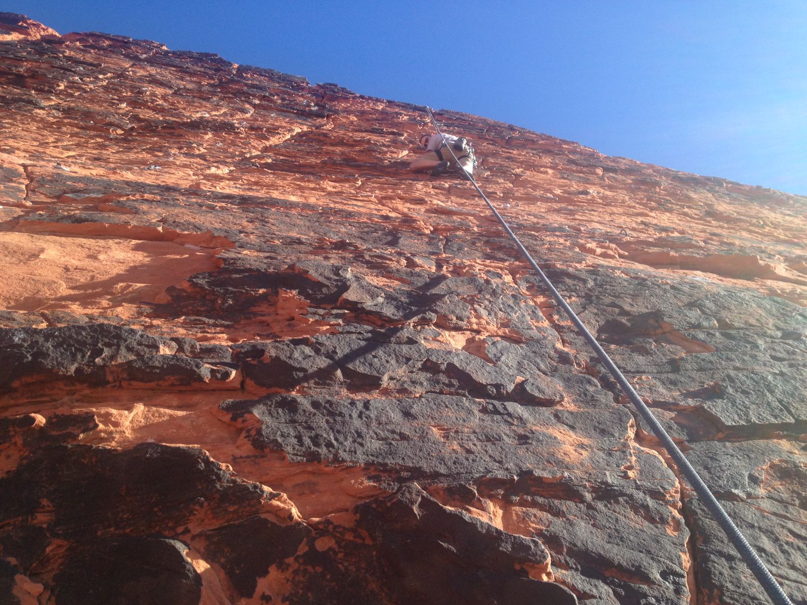 It took about 30 minutes to find the path and rock scramble our way to the cliff. When we got there we found a perfect sandstone wall with a dozen or so climbs all about 20m high. The area is completely bolted, so all the climbs were pure sport climbs ranging between 5.8-5.10b in the US scale (17-20 in the Australian scale).