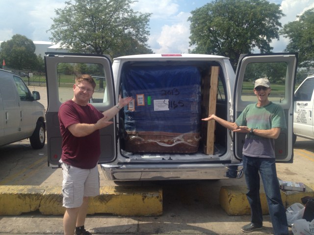 During this time, we embarked on removing the back 2 rows of seats from the van. After a couple of hours running around to get the right tools to properly set up the back of the van, we got a call to say that the balloon had cleared customs. The wait ended up being a blessing in disguise because we would not have been able to get the balloon into the van without those couple of hours of rearranging things in it.