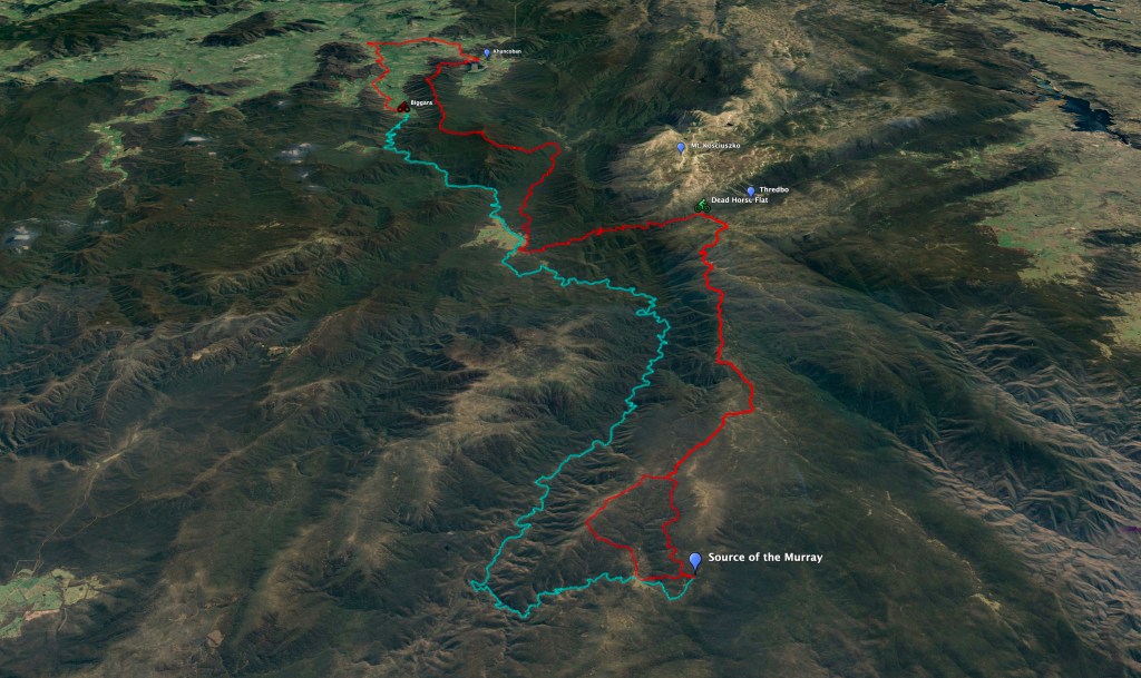 After I have hiked (strolled) down from the Summit, I will meet Kath at Dead Horse Gap and pick up my bike and camping gear. I will then ride down Cascade and Cowombat Trails to Tin Mine Hut (about 40km). From there I will be able to hike the few kilometers to the true source of the Murray (based on GPS coordinates). Apparently there is a small marker in the middle of the bush.