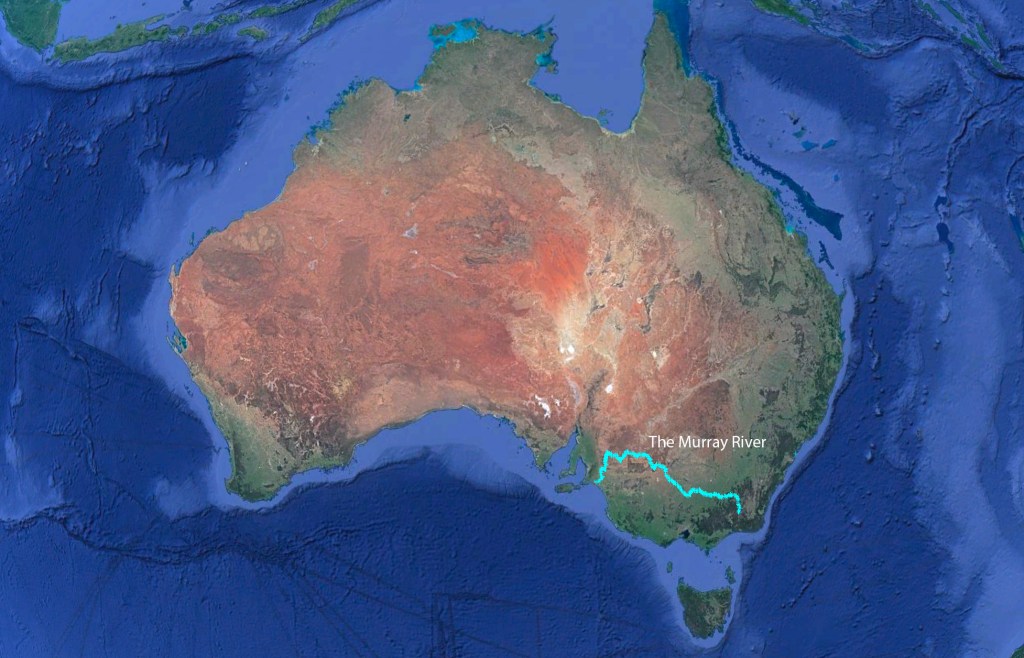 For those not familiar with the Murray River, it is the longest river in Australia (2,508km / 1,558mi) and flows from the Snowy Mountains, near Mt Kosciuszko (Australia’s tallest mountain), along the New South Wales/Victoria border, into South Australia, and then eventually flows into the Great Australian Bight at Goolwa (near Adelaide).